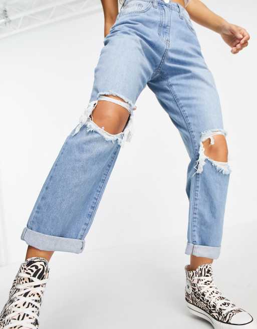 Parisian Petite Ripped Mom Jeans In Blue Asos